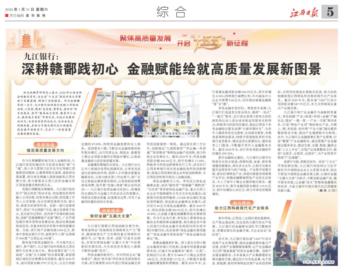 服务地方彰显金融担当。作为地方法人银行、骨干银行,九江银行始终将服务江西发展作为安身立命之本。紧扣省委打造“三大高地”、实施“五大战略”的决策部署,紧密围绕区域经济发展需求攻坚服务,截至2025年末,省内贷款余额2797.27亿元,占全行贷款总额的87.09%,持续将金融资源向本土倾斜。坚持服务小微,不断优化金融资源供给和服务模式,全行民营企业、制造业、普惠型小微企业贷款余额均实现稳步增长,以高质量金融助力经济高质量发展。