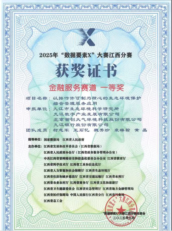 9月29日,省发改委(省数据局)在南昌市举行2025年“数据要素×”江西分赛总结表彰会。会上通报,由九江市生态环境局科学研究所、九江数字产业发展有限公司、北京首创大气环境科技股份有限公司、九江银行股份有限公司联合报送的《以排污许可制为核心的生态环境保护综合管理服务应用》参赛作品,荣获“数据要素×金融服务”赛道决赛一等奖,录取晋级国家赛资格。